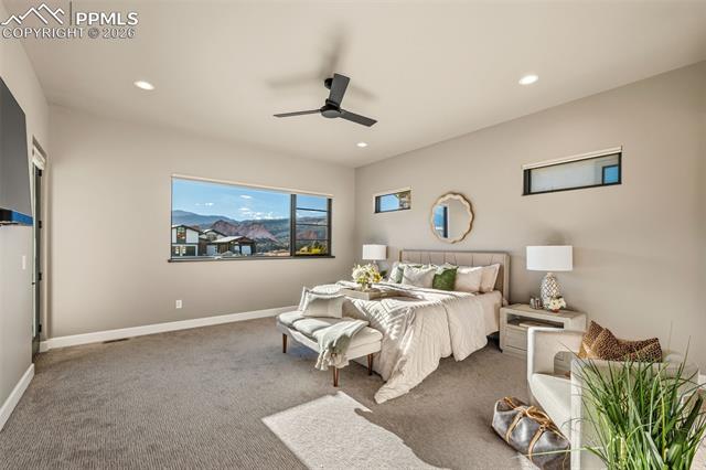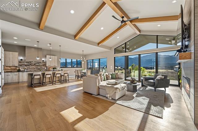 GORGEOUS GATED CATHEDRAL RIDGE HOME! This outstanding 4 bed+office, 4 bath home offers exceptional views of Pikes Peak, the Front Range, and the Garden of the Gods rock formations. Located in the gated community of Catheral Ridge. The vaulted ceilings and floor to ceiling windows provide excellent natural light and the ability to enjoy your views from any room while entertaining or simply enjoying the majestic mountains of Colorado. The custom features throughout included hardwood flooring, custom cabinetry, wood beamed ceilings, main level master with en-suite bath, many walkouts to deck with built in gas fireplace, and two additional bedrooms. The lower level features a wet bar, additional family room, office/gym, the remaining two bedrooms and patio with fenced backyard for pets or privacy.