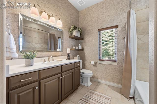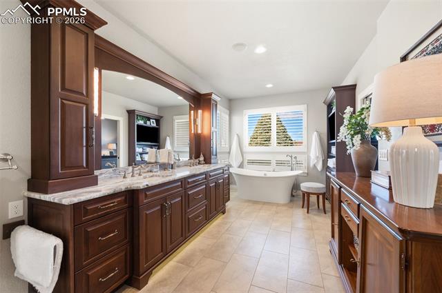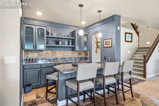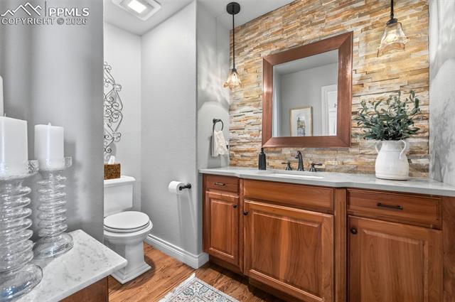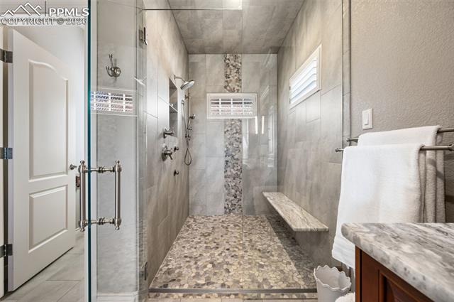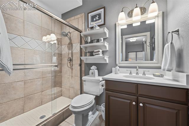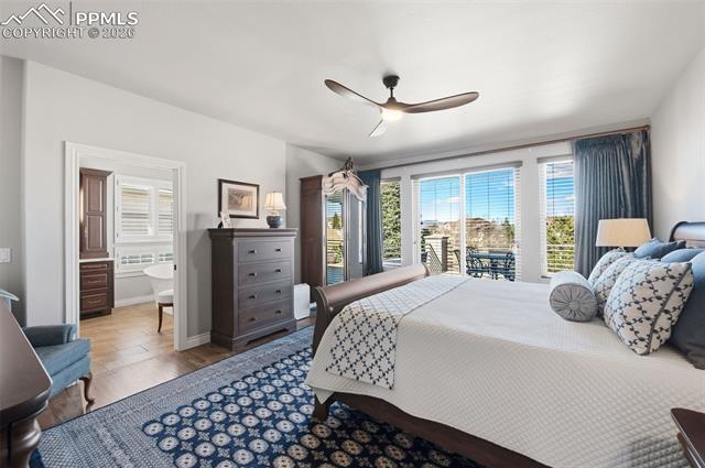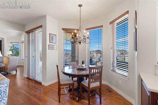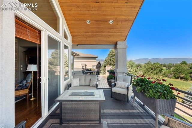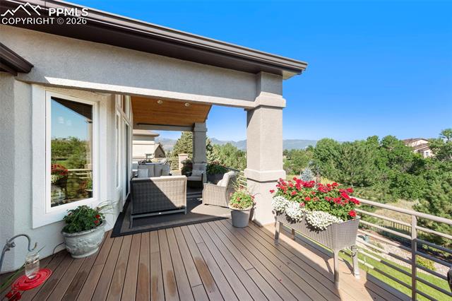 Gorgeous Custom Home Overlooking 2nd Tee Box of Pine Creek Golf Course! This five-bedroom, four bath home is loaded with upgrades and custom features from the main floor hardwood floors to the large windows that showcase the tremendous views. The great room features stone fireplace with natural gas, custom mantle, and soaring ceilings. Easy walkout to the covered deck with composite decking and multiple seating areas perfect to enjoy spectacular views of the Front Range, Air Force Academy and Pine Creek golf course. There is a separate dining room which is perfect for an intimate dinner and allows easy access to the kitchen. The open gourmet kitchen includes granite countertops, Subzero & Wolf appliances, microwave drawer, large walk-in kitchen pantry, breakfast nook, counter bar, and lots of natural light. The spacious master suite offers a walkout to the deck , sitting area, large closet and adjoining 5-piece master bath with heated floors and under cabinet motion detector lighting . The walkout lower-level features large family room, with room for exercise or game area, covered patio and a custom wet bar with dishwasher, disposal, granite counter top, mini fridge. There are 3 additional ample sized bedrooms plus storage/bonus room with built-in shelving. The Oversized 3 car garage offers a shop area, with cabinetry, shelving, and epoxy floor. Fully xeriscape front and rear yards. New HVAC systems, plumbing upgrades, new exterior paint & stucco and much more. The views and amenities make this home a must see!